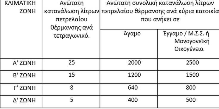 - Για κάθε κατοικία, ανεξαρτήτως ζώνης, χορηγείται επίδομα σε άγαμους για τα πρώτα 80 τετραγωνικά μέτρα και για τα πρώτα 100 μέτρα για τους έγγαμους και τις μονογονεϊκές οικογένειες, με ανώτατη κατανάλωση πετρελαίου θέρμανσης ανά κλιματική ζώνη και ανά τετραγωνικό ως ακολούθως: