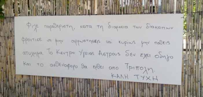 «Φίλε παραθεριστή, κατά την διάρκεια των διακοπών φρόντισε να μην αρρωστήσεις και κυρίως να μην πάθεις ατύχημα. Το Κέντρο Υγείας Άστρους δεν έχει οδηγό και το ασθενοφόρο θα έρθει από Τρίπολη. ΚΑΛΗ ΤΥΧΗ».