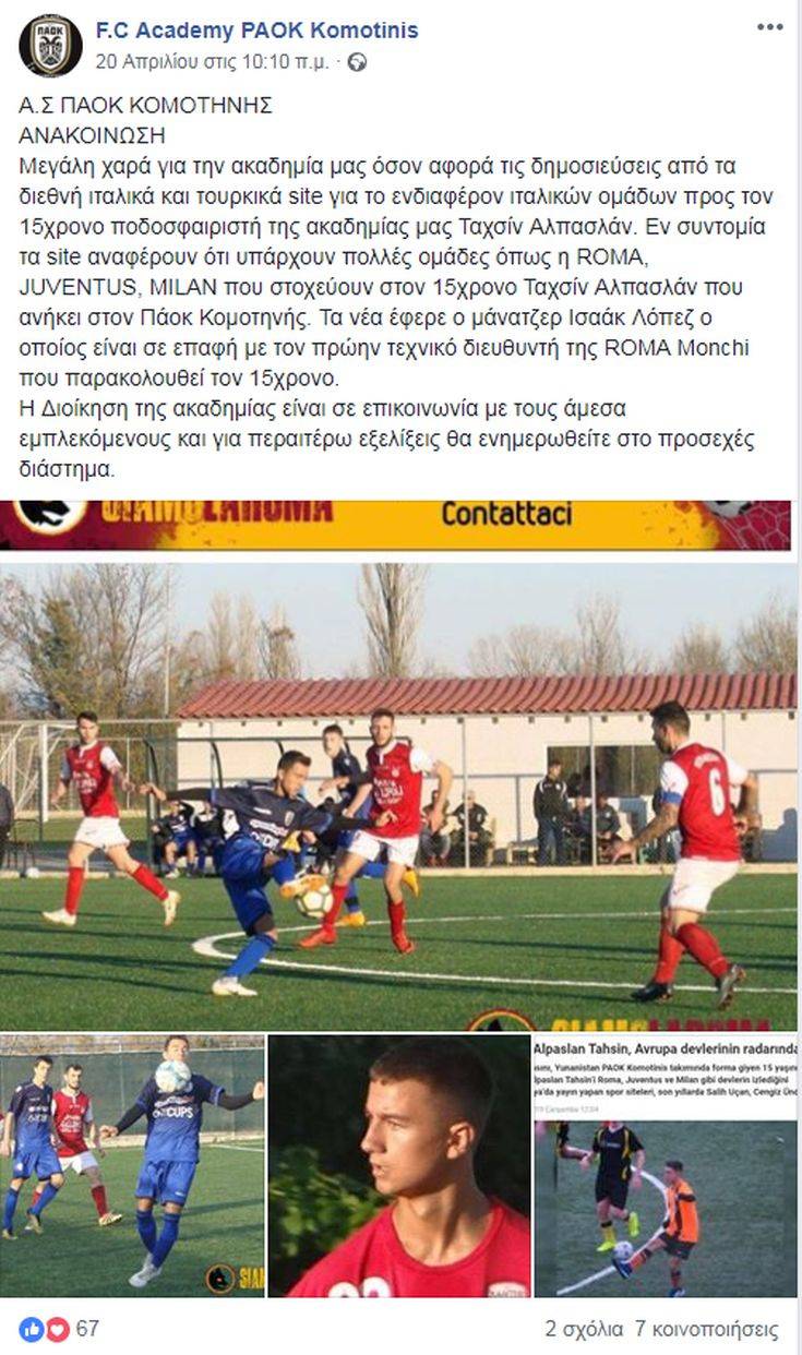 «Μεγάλη χαρά για την Ακαδημία μας όσον αφορά τις δημοσιεύσεις σε διεθνή ιταλικά και τουρκικά site για το ενδιαφέρον ιταλικών ομάδων προς τον 15χρονο ποδοσφαιριστή της Ακαδημίας μας Αλπασλάν Ταχσίν. Εν συντομία τα sites αναφέρουν ότι υπάρχουν πολλές ομάδες όπως οι Roma, Juventus, Milan, που στοχεύουν στον 15χρονο Ταχσίν Αλπασλάν που ανήκει στον ΠΑΟΚ Κομοτηνής. Τα νέα έφερε ο μάνατζερ Ισαάκ Λόπεζ ο οποίος είναι σε επαφή με τον πρώην τεχνικό διευθυντή της Roma, Μonchi, που παρακολουθεί τον 15χρονο. Η Διοίκηση της Ακαδημίας μας είναι σε επικοινωνία με τους άμεσα εμπλεκόμενους και για περαιτέρω εξελίξεις θα υπάρξει ενημέρωση».