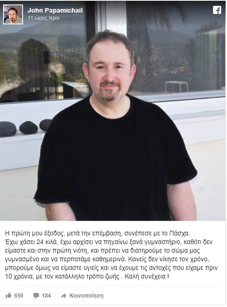 «Η πρώτη μου έξοδος, μετά την επέμβαση, συνέπεσε με το Πάσχα. Έχω χάσει 24 κιλά, έχω αρχίσει να πηγαίνω ξανά γυμναστήριο, καθότι δεν είμαστε και στην πρώτη νιότη, και πρέπει να διατηρούμε το σώμα μας γυμνασμένο και να περπατάμε καθημερινά. Κανείς δεν νίκησε τον χρόνο, μπορούμε όμως να είμαστε υγιείς και να έχουμε τις αντοχές που είχαμε πριν 10 χρόνια, με τον κατάλληλο τρόπο ζωής . Καλή συνέχεια!».