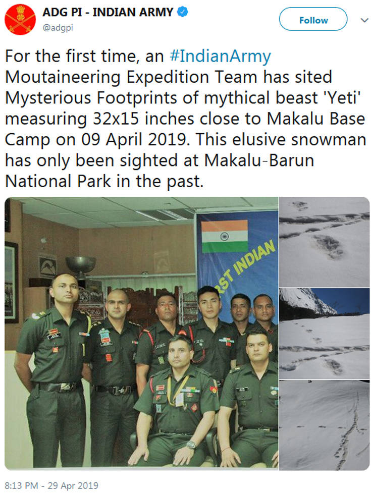 Ο Στρατός της Ινδίας ανακοίνωσε χθες, Δευτέρα 29 Απριλίου, στον λογαριασμό του στο Twitter, τον οποίο ακολουθούν περίπου 6 εκατομμύρια άνθρωποι, ότι ανακάλυψε «μυστηριώδεις πατημασιές του μυθικού τέρατος Γέτι στον καταυλισμό βάσης Μακάλου».