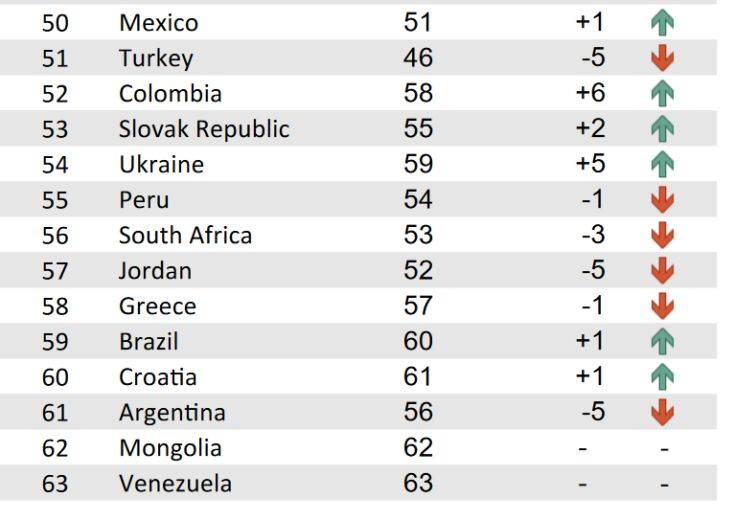 Λαμβανομένων υπόψη 342 υποδεικτών, η Ελλάδα κατατάσσεται στην 58η θέση μεταξύ 63 χωρών, ανήκοντας στην ομάδα των δέκα κρατών-ουραγών, μαζί με τις χώρες Ουκρανία, Περού, Νότια Αφρική, Ιορδανία, Βραζιλία, Κροατία, Αργεντινή, Μογγολία και Βενεζουέλα, σύμφωνα πάντα με τα αποτελέσματα της Παγκόσμιας Επετηρίδας, τα οποία έδωσε σήμερα στη δημοσιότητα ο Σύνδεσμος Βιομηχανιών Ελλάδος (ΣΒΕ).