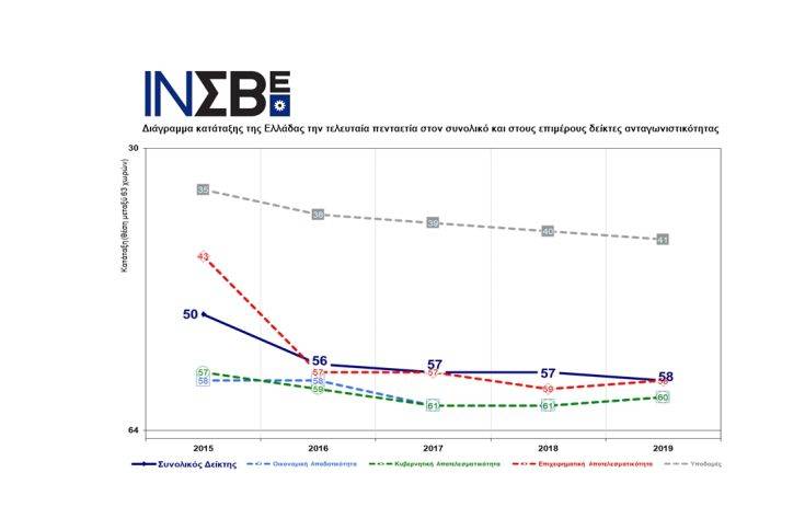 Σε αντίθεση με τις τρεις προηγούμενες κατηγορίες δεικτών, στην κατηγορία των «Υποδομών» σημειώνεται μικρή επιδείνωση της κατάταξης της χώρας: συγκεκριμένα από την τεσσαρακοστή θέση του 2018, το 2019 κατατάσσεται τεσσαρακοστή πρώτη, εμφανίζοντας υποχώρηση για πέμπτη συνεχόμενη χρονιά (σ.σ.τα αποτελέσματα και η συνολική αξιολόγηση της ελληνικής οικονομίας με όρους ανταγωνιστικότητας για την επετηρίδα του 2019 αφορούν τις επιδόσεις της κατά την προηγούμενη χρονιά, το 2018). Η Παγκόσμια Επετηρίδα Ανταγωνιστικότητας (WCY) του IMD, αποτελεί -κατά τον ΣΒΕ- το πλέον αξιόπιστο «εργαλείο» διεθνών επενδυτών στο πλαίσιο της συνολικής αξιολόγησης του περιβάλλοντος δραστηριοποίησης των επιχειρήσεων σε χώρες και περιφέρειες, για την εξαγωγή των αποφάσεών τους σχετικά με την επιλογή τοποθεσίας χωροθέτησης των διεθνών τους δραστηριοτήτων.