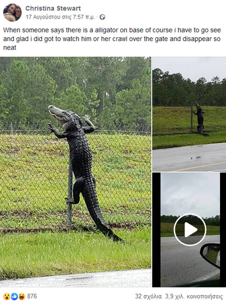 Σύμφωνα με τη New York Post, ένας αλιγάτορας φαίνεται σε βίντεο να σκαρφαλώνει σε συρμάτινο φράχτη έξω από μία στρατιωτική βάση στην πόλη Τζάκσονβιλ της Φλόριντα.