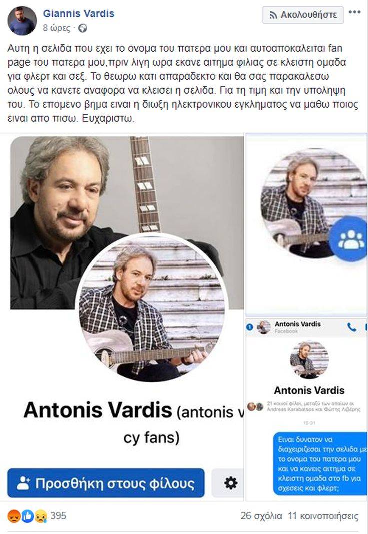 «Αυτή η σελίδα που έχει το όνομα του πατέρα μου και αυτοαποκαλείται fan page του πατέρα μου, πριν λίγη ώρα έκανε αίτημα φιλίας σε κλειστή ομάδα για φλερτ και σεξ. Το θεωρώ κάτι απαράδεκτο και θα σας παρακαλέσω όλους να κάνετε αναφορά να κλείσει η σελίδα. Για τη τιμή και την υπόληψη του. Το επόμενο βήμα είναι η δίωξη ηλεκτρονικού εγκλήματος να μάθω ποιος είναι από πίσω. Ευχαριστώ» έγραψε ο Γιάννης Βαρδής φανερά εκνευρισμένος.