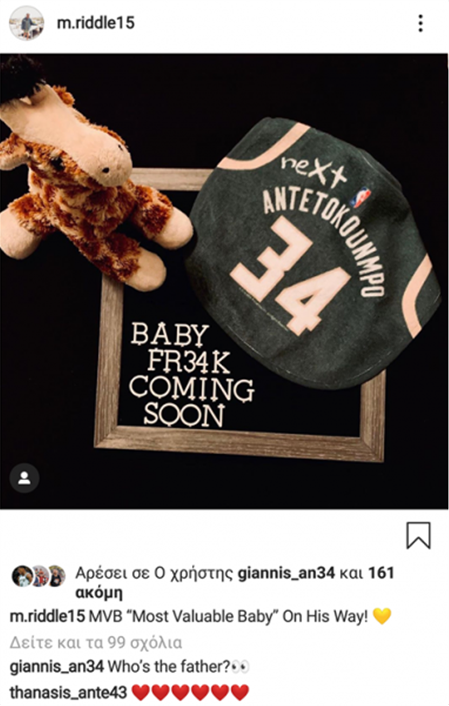 Κάτω από τη φωτογραφία που ανέβασε η Mariah Riddlesprigger έγραψε: “Most Valuable Baby” on the way. Το σχόλιο της είχε σχέση με το ότι ο 24χρονος μπασκετμπολίστας ψηφίστηκε MVP στο NBA. Ο Greek Freaκ, όπως είναι το παρατσούκλι του, με διάθεση περιπαιχτική την ρώτησε ποιος είναι ο πατέρας.