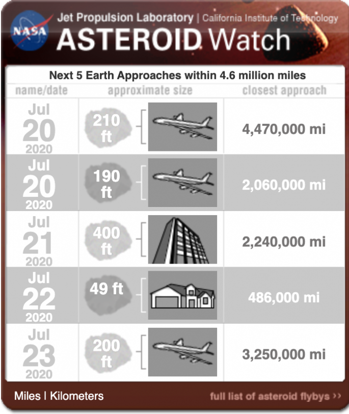 Στις 22 του μήνα θα περάσει κοντύτερα από όλους (στα 486,000 μίλια) ο μικρότερος της παρέας με 49 πόδια μήκος (14,9 μέτρα). Η πεντάδα θα κλείσει στις 23 του μήνα με έναν ακόμα αστεροειδή που έχει μήκος 200 πόδια (60,9 μέτρα) και έχει απόσταση 3.250.000 μιλίων από τη Γη.