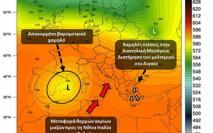 Το προγνωστικό μοντέλο υψηλής ανάλυσης BOLAM δείχνει ότι ένα αποκομμένο χαμηλό στη δυτική Μεσόγειο θα προκαλέσει από την Τρίτη μεταφορά θερμών αερίων μαζών στη μέση και στην ανώτερη τροπόσφαιρα προς τη Νότια Ιταλία και τα Βαλκάνια. Το αποτέλεσμα θα είναι ότι η μέγιστη τιμή της θερμοκρασίας στη χώρα μας αναμένεται να φτάνει τοπικά τους 36 - 38 βαθμούς έως και την Πέμπτη, ενδεχομένως την Παρασκευή.