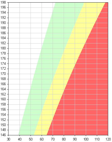 Κάθετα: Ύψος, Οριζόντια: κιλά, λευκό: λιποβαρής, πράσινο: κανονικό βάρος, κίτρινο: υπέρβαρος, κόκκινο: παχύσαρκος