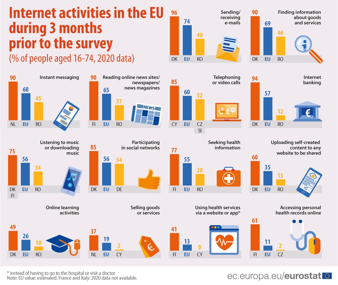 Τα στοιχεία της Eurostat δείχνουν ότι συνολικά το ποσοστό των Ευρωπαίων πολιτών που χρησιμοποιούν το Διαδίκτυο αυξήθηκαν το 2020: Το 87% των Ευρωπαίων, ηλικίας 16-74 ετών, έκανε χρήση του Ίντερνετ τους τελευταίους τρεις μήνες του 2020.