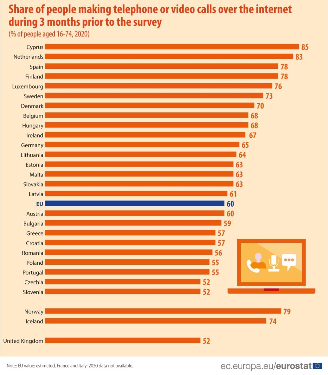 Οι τηλεφωνικές κλήσεις ή βιντεοκλήσεις μέσω Ίντερνετ σημείωσαν τη μεγαλύτερη αύξηση σε σύγκριση με το 2019 (52%) καθώς και από την αρχή της συλλογής δεδομένων από τη Eurostat (17% το 2008). «Πρωταθλήτρια» Ευρώπης για το εξεταζόμενο διάστημα (σσ το τελευταίο τρίμηνο του 2020) αναδείχθηκε η Κύπρος, όπου το 85% των πολιτών πραγματοποίησε τηλεφωνήματα και βιντεοκλήσεις μέσω Διαδικτύου.