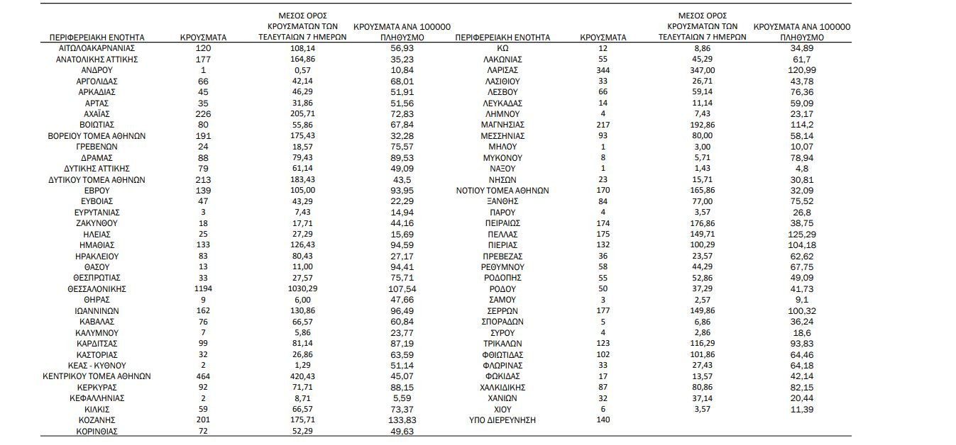 Την ίδια ώρα σύμφωνα με τα τελευταία δεδομένα για την περίοδο 23 – 29 Απριλίου, τα οποία αφορούν τον συνδυαστικό δείκτη τεστ, τα νέα κρούσματα και τον δείκτη θετικότητας, το μεγαλύτερο μέρος της Ελλάδας είναι στο «κόκκινο», εκτός από τα νησιά του Αιγαίου και τα Δωδεκάνησα που βρίσκονται στο «πορτοκαλί».