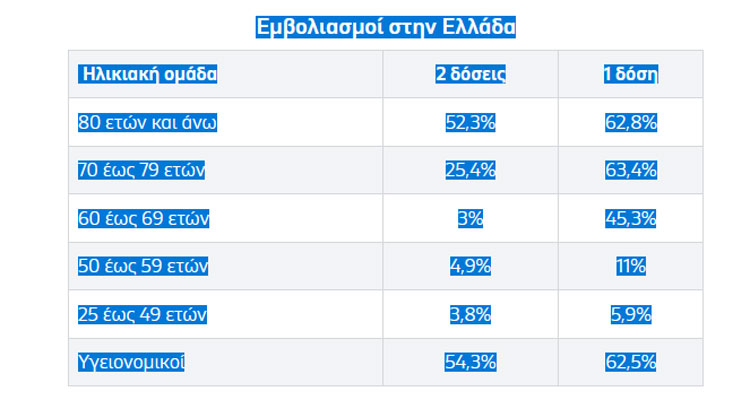 Χαμηλή είναι η κάλυψη στην ομάδα 50 - 59 ετών, στην οποία έχει εμβολιαστεί πλήρως το 4,9%, ενώ μία δόση έχει λάβει το 11%.