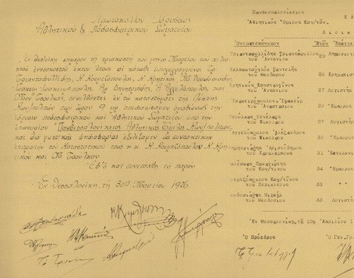 «Εν Θεσσαλονίκη σήμερον τη τριακοστή του Μηνός Μαρτίου του χιλιοστού εννεακοσιοστού εικοστού έκτου έτους οι κάτωθι υπογεγραμμένοι Τρ. Τριανταφυλλίδης, Κ. Κοεμτζόπουλος, Κ. Κρητικός, Μ. Θεοδοσιάδης, Ιωακείμ Ιωακειμόπουλος, Αρ. Δημητριάδης, Α. Αγγελόπουλος, και Μεν. Τσούλκας, συνελθόντες εν τω καταστήματι της Λέσχης Κων/πολιτών περί ώραν 9 μ.μ. απεφασίσαμεν ομοφώνως την ίδρυσιν ποδοσφαιρικού και Αθλητικού Σωματείου υπό την επωνυμίαν «Πανθεσσαλονίκειος Αθλητικός Όμιλος Κων/πολιτών» και διά μυστικής ψηφοφορίας εξελέξαμεν ως συντακτικήν επιτροπήν του Καταστατικού τους κ.κ. Κ. Κοεμτζόπουλον, Κ. Κρητικόν και Μ. Τσούλκαν.