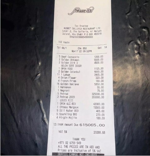 Αυτό ακριβώς έδειξε στην ανάρτηση του στο Instagram ο Salt Bae, με τον λογαριασμό του εστιατορίου να ανέρχεται στο ιλιγγιώδες ποσό των 615.065 ντιρχάμ ΗΑΕ, που ισοδυναμεί με περίπου 151.000 ευρώ.