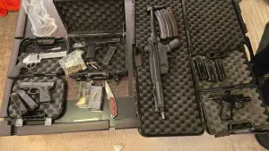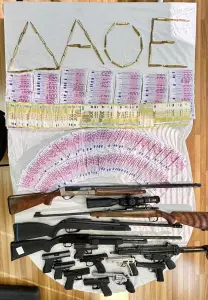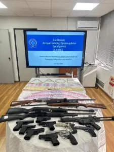 - υποπολυβόλο, -12- πιστόλια, -2- περίστροφα, -4- τυφέκια και καραμπίνες, -22- γεμιστήρες, -1.642- φυσίγγιακαι χειροβομβίδα κρότου λάμψης,